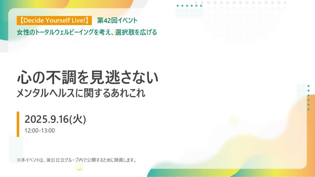 2025年9月16日、『日立グループ女性ERG』主催のオンラインイベント「心の不調を見逃さない メンタルヘルスに関するあれこれ」に、Reの小林が登壇しました。